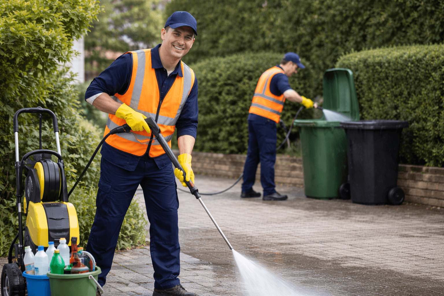 Reinigung von Mülltonnen, Gehwegen und Auffahrten – einmalig oder regelmäßig.